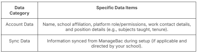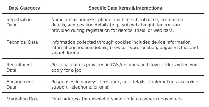 Note on Special Category Data: We do not process special category data (e.g., race, ethnicity) for our own purposes. Your school may instruct us to process it on their behalf; we do not use it for any other purpose.