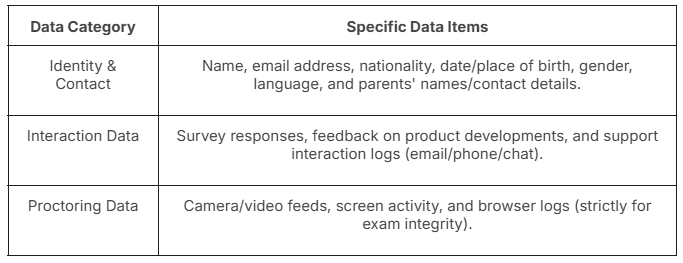 Legal Basis: As per Rule 3(b)(i) of the DPDPA Rules, AssessPrep is required to share an "itemised description" of the personal data that we collect.